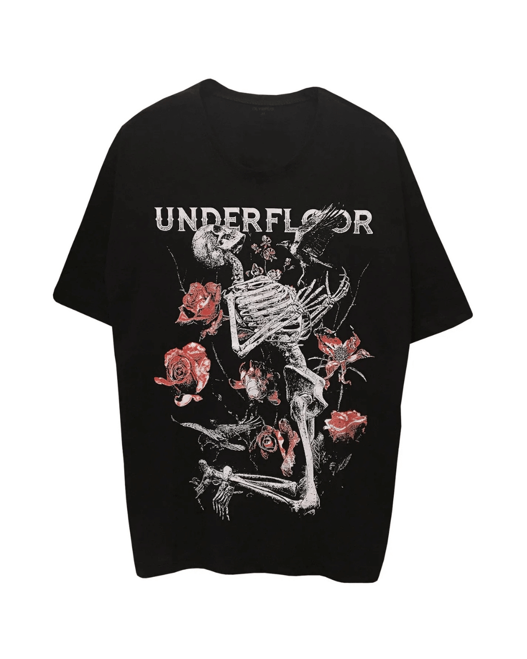 Camiseta unisex oversize de estilo urbano con estampado de esqueleto y rosas. Ideal para quienes buscan un look alternativo, cómodo y con mucha actitud.