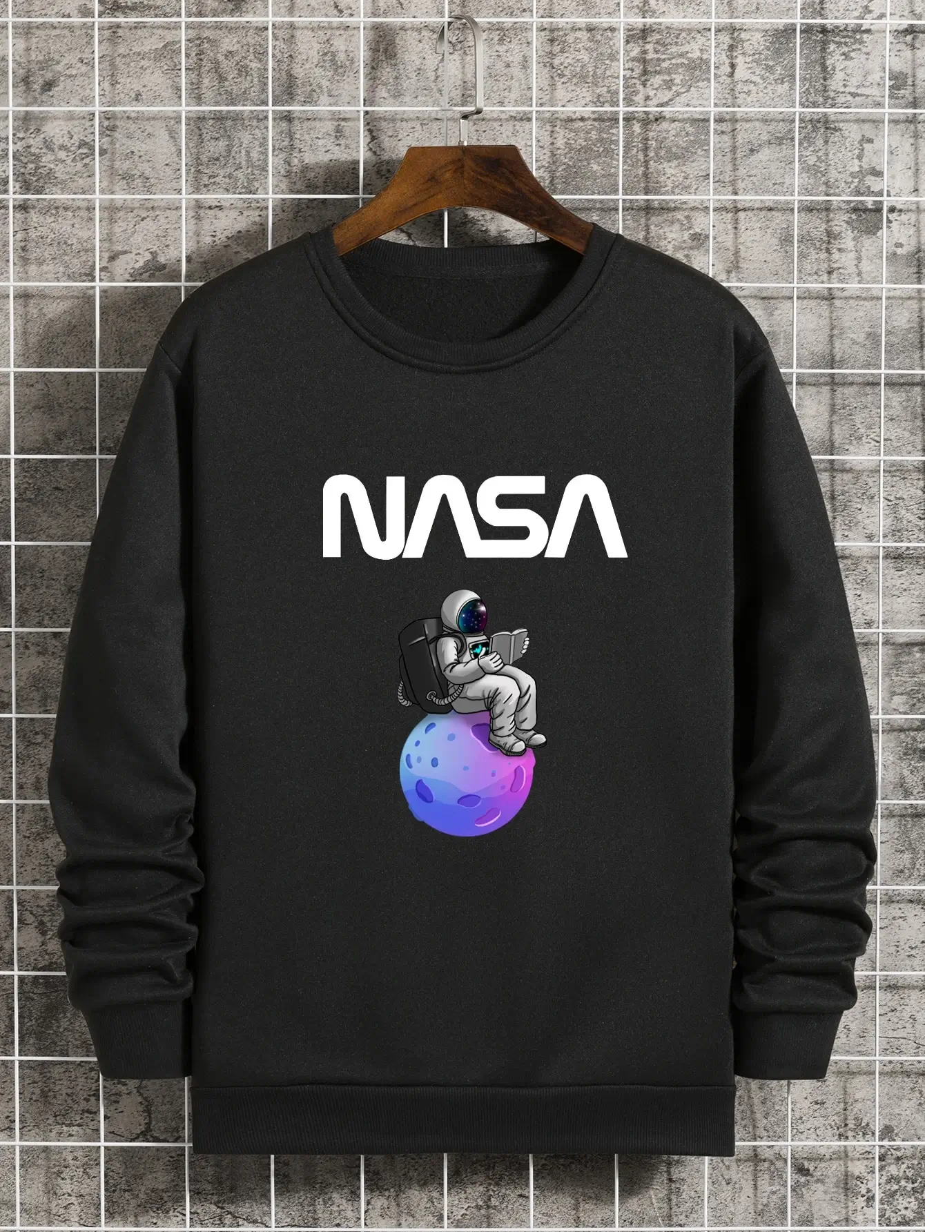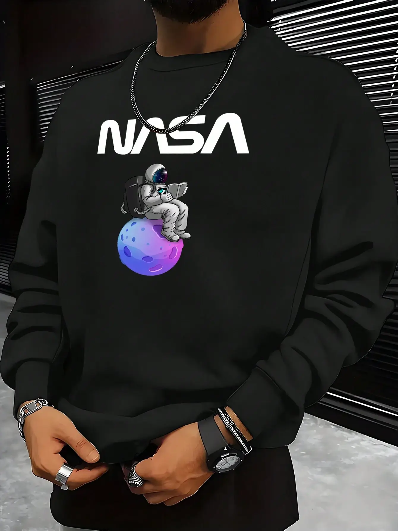 Añade un toque cósmico a tu guardarropa con este moderno suéter negro de NASA. Presenta un diseño llamativo con el icónico logo de NASA en la parte superior, acompañado de una colorida ilustración de un astronauta sentado sobre un planeta púrpura.